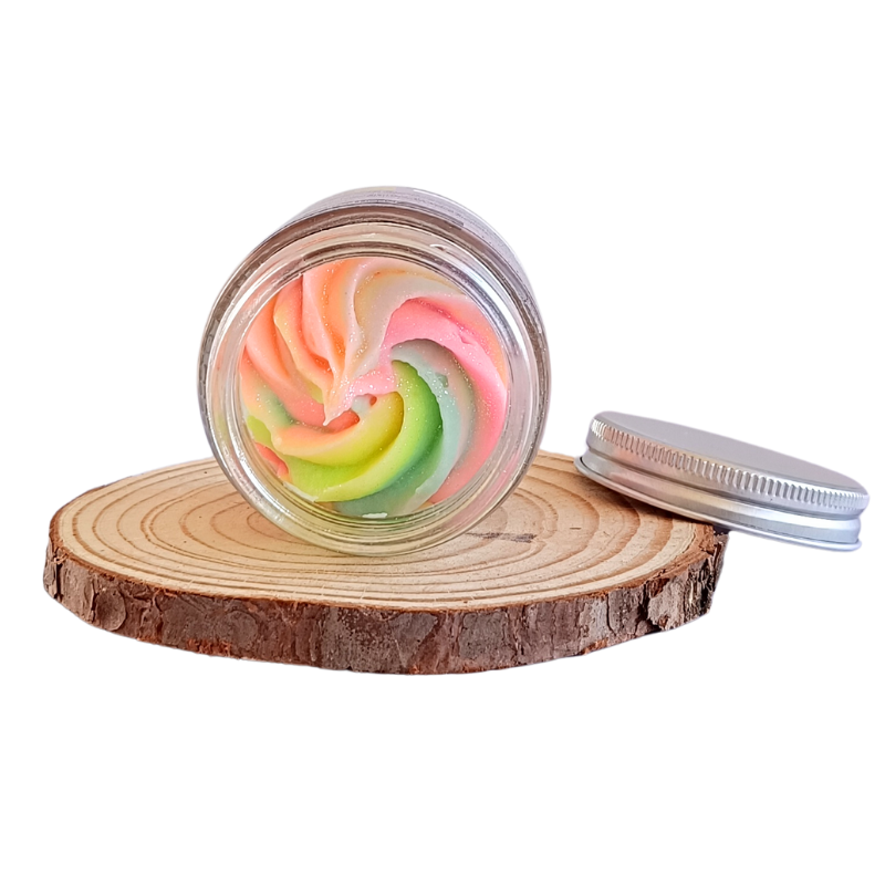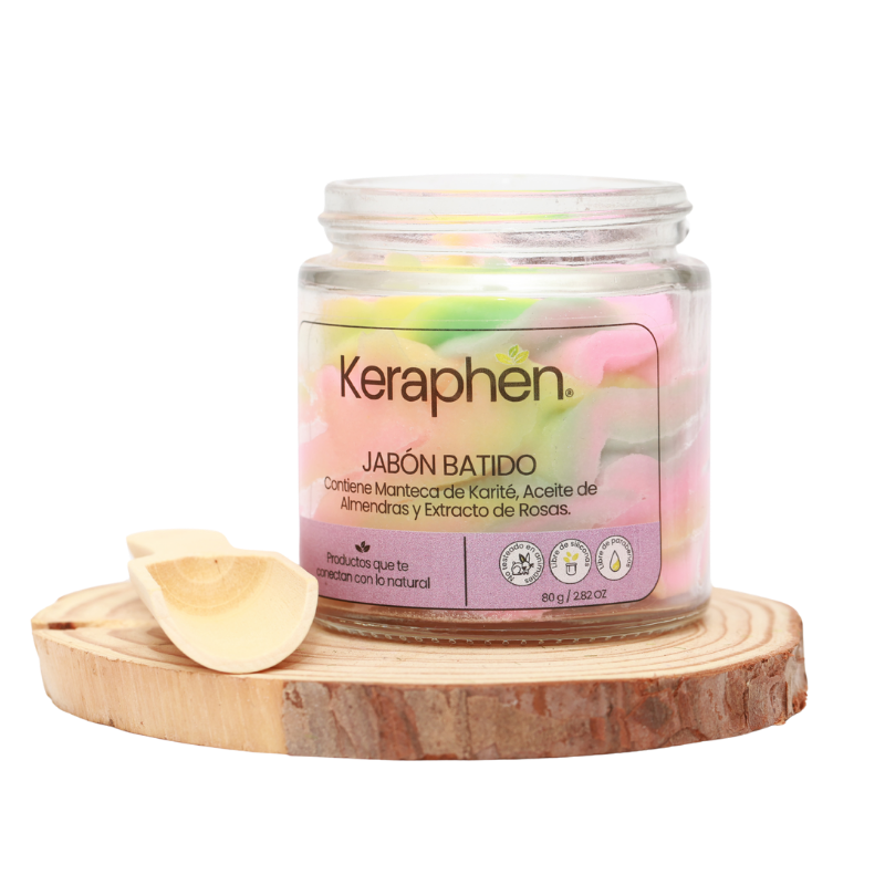Jabón batido hidratante para baño y ducha, que no solo limpia, sino que también nutre e hidrata tu piel de manera excepcional, con Manteca de karité, Aceite de Almendras y Extractos de Rosas, botella de vidrio reutilizable.